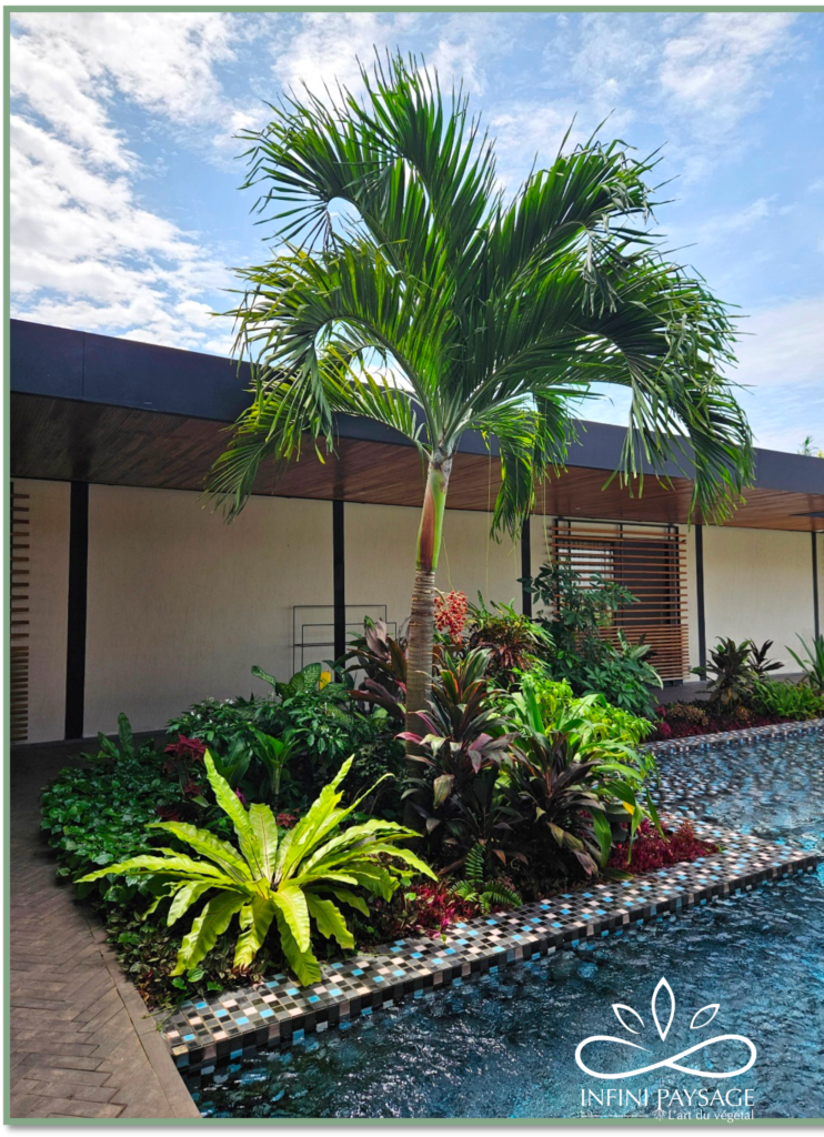 Le palmier royal existant est en bonne santé, à l’inverse du Frangipanier qui végète par manque de soleil. Les racines du cecropia endommagent le carrelage de la terrasse.
